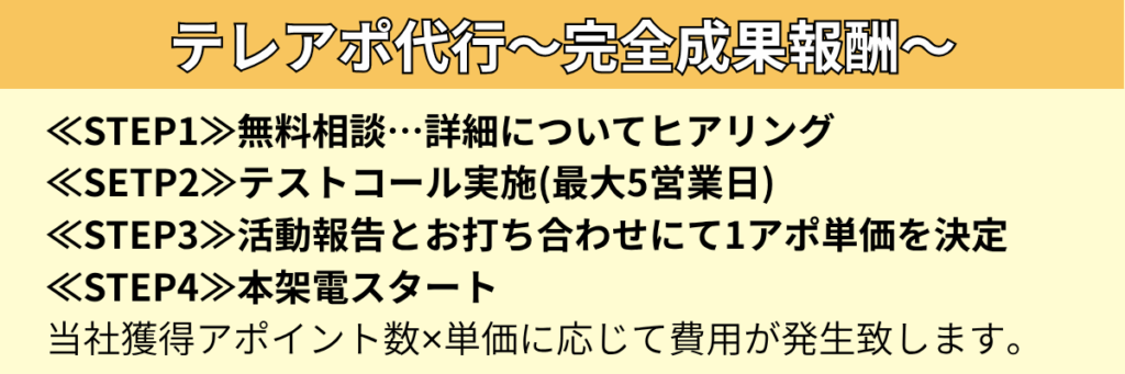 ※商材やアポ定義によっては当社ではお役に立てないと判断させて頂く場合は本契約移行を中止させて頂きます。
